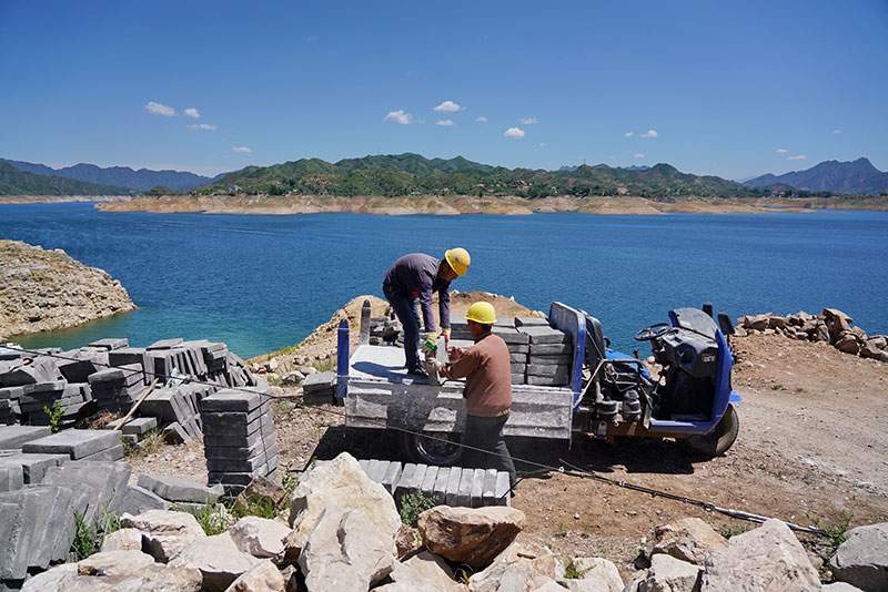 6月3日,工人在喜峰口西潘家口段長城保護(hù)維修工程施工現(xiàn)場搬運(yùn)維修所需磚石。