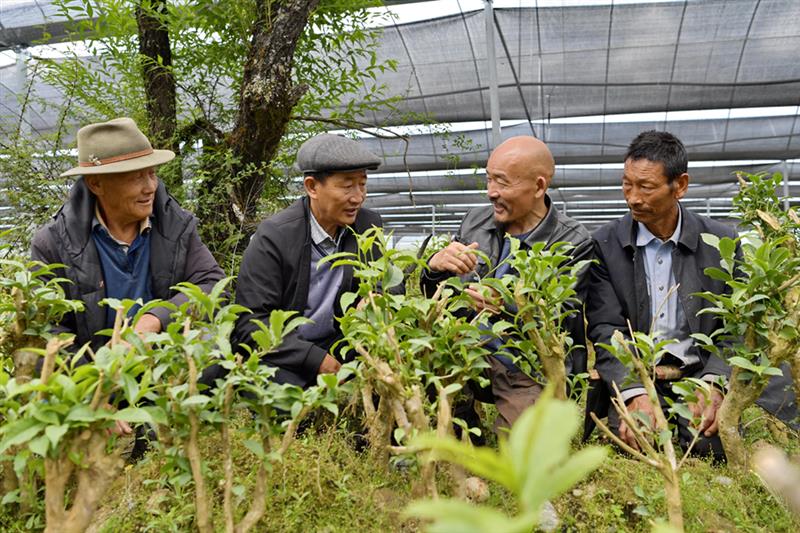 在西藏波密縣易貢鄉(xiāng)貢仲村金茶樹苗圃里,西藏金茶樹茶葉有限公司負責人張延禮(右二)向村民介紹茶樹管理技術(shù)(5月23日攝)。新華社記者 張汝鋒 攝