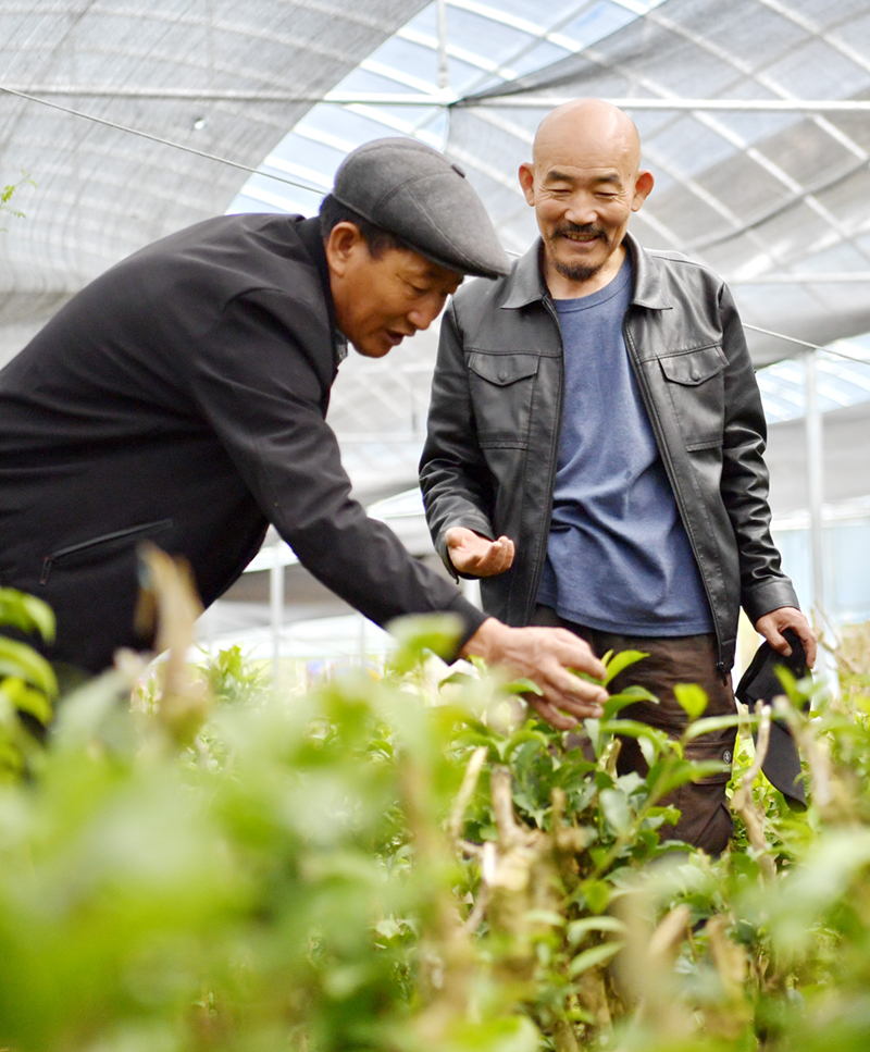 在西藏波密縣易貢鄉(xiāng)貢仲村金茶樹苗圃,村黨支部書記宗珠(左)和西藏金茶樹茶葉有限公司負責人張延禮(右)進行茶樹管理(5月23日攝)。新華社記者 張汝鋒 攝