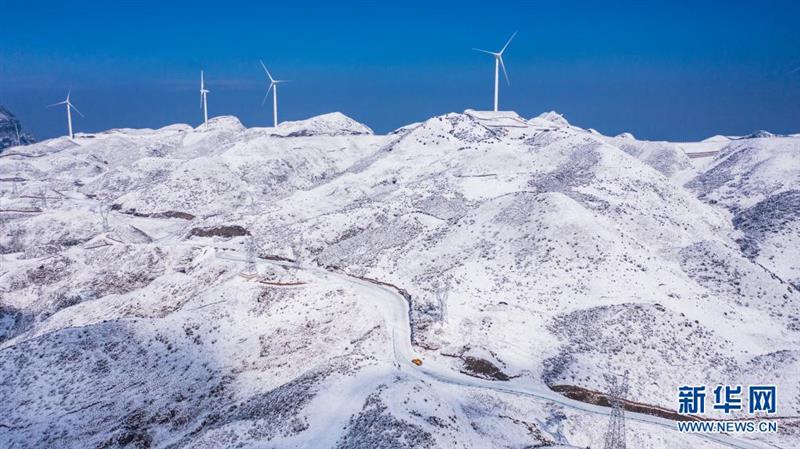 雪后的六盤水市盤州四格風(fēng)電場(chǎng)(1月12日攝,無人機(jī)照片)。新華社記者 陶亮 攝