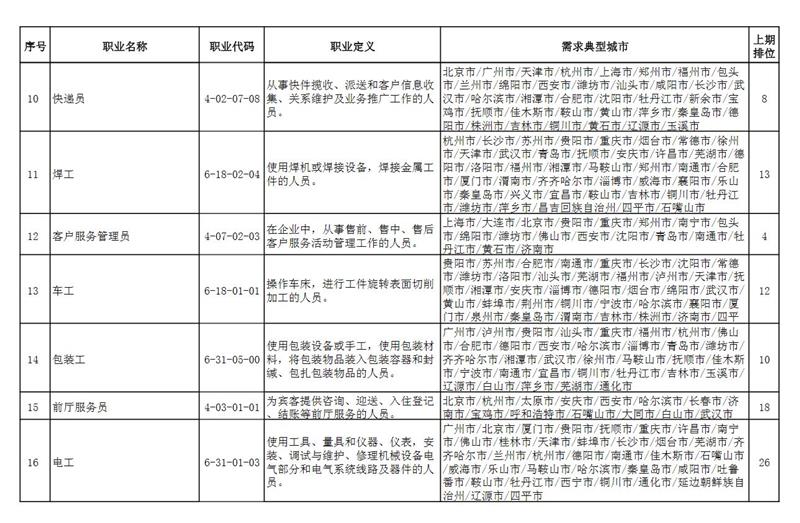 此外,排行“前十”職業(yè)略有變化,本期“市場營銷專業(yè)人員”“商品營業(yè)員”“儀器儀表制造工”進入前十,“客戶服務管理員”“汽車生產線操作工”“包裝工”退出前十。