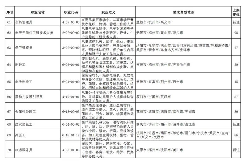 三是生活服務業(yè)相關職業(yè)需求仍保持旺盛勢頭。除仍舊位列前十的“保潔員”“餐廳服務員”“家政服務員”外,“美容師”“嬰幼兒發(fā)展引導員”“養(yǎng)老護理員”等職業(yè)排位上升,呈現(xiàn)短缺程度加大的趨勢。