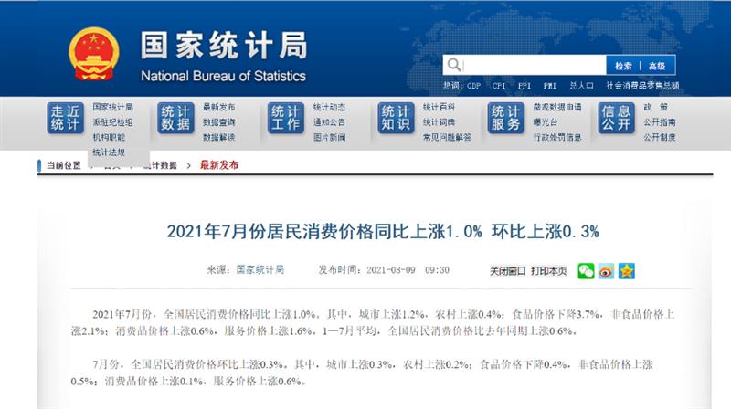 2021年7月份,全國居民消費價格同比上漲1.0%。其中,城市上漲1.2%,農(nóng)村上漲0.4%;食品價格下降3.7%,非食品價格上漲2.1%;消費品價格上漲0.6%,服務(wù)價格上漲1.6%。1-7月平均,全國居民消費價格比去年同期上漲0.6%。