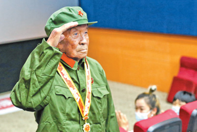 圖為河北滄州鹽山縣韓集鎮(zhèn)王復(fù)娥村九旬抗美援朝老兵王金榮,觀看電影《長(zhǎng)津湖》后起立敬禮。王洪勝攝(人民視覺(jué)) |