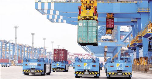 左圖 11月7日,山東港口青島港自動(dòng)化碼頭,自動(dòng)起重機(jī)在吊裝外貿(mào)集裝箱。