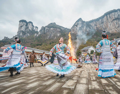 1月2日,貴州黔西新仁苗族鄉(xiāng)化屋村,苗族同胞和游客圍著篝火跳舞。羅大富攝(新華社發(fā))
