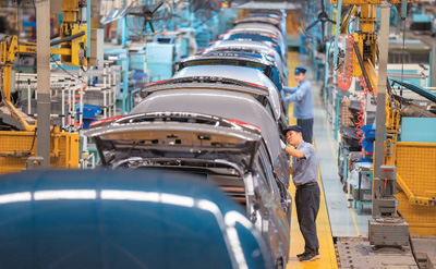 10月11日,海南省??谑心称嚮氐纳a(chǎn)車間內(nèi),工作人員在新能源車生產(chǎn)線上作業(yè)。