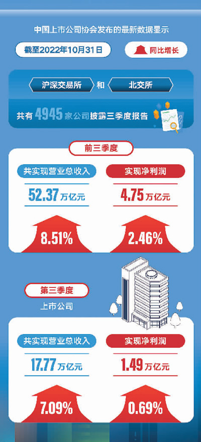 上市公司運行情況是觀察中國經(jīng)濟的窗口之一。中國上市公司協(xié)會近日發(fā)布的最新數(shù)據(jù)顯示,截至2022年10月31日,滬深交易所和北交所共有4945家公司披露三季度報告,前三季度共實現(xiàn)營業(yè)總收入52.37萬億元,占GDP總額的60.18%,同比增長8.51%;實現(xiàn)凈利潤4.75萬億元,同比增長2.46%。總體來看,盡管面臨多重壓力,但上市公司前三季度依然交出了一份來之不易的成績單。