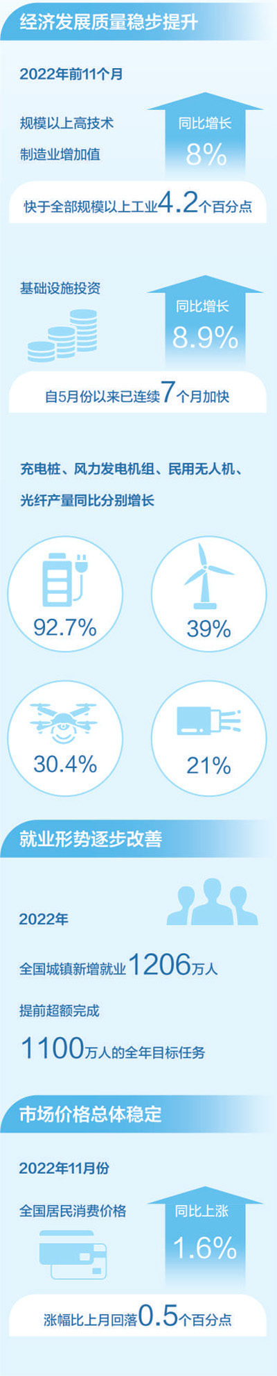 2022年,面對風高浪急的國際環(huán)境和艱巨繁重的國內(nèi)改革發(fā)展穩(wěn)定任務,我國經(jīng)濟穩(wěn)健發(fā)展,全年國內(nèi)生產(chǎn)總值預計超過120萬億元??垂┙o結(jié)構(gòu),產(chǎn)業(yè)升級發(fā)展持續(xù),新動能積蓄增強。2022年前11個月,規(guī)模以上高技術(shù)制造業(yè)增加值同比增長8%,快于全部規(guī)模以上工業(yè)4.2個百分點;看消費需求,線上消費需求釋放帶動作用明顯。前11個月,全國實物商品網(wǎng)上零售額同比增長6.4%,網(wǎng)絡購物帶動快遞等行業(yè)較快增長。