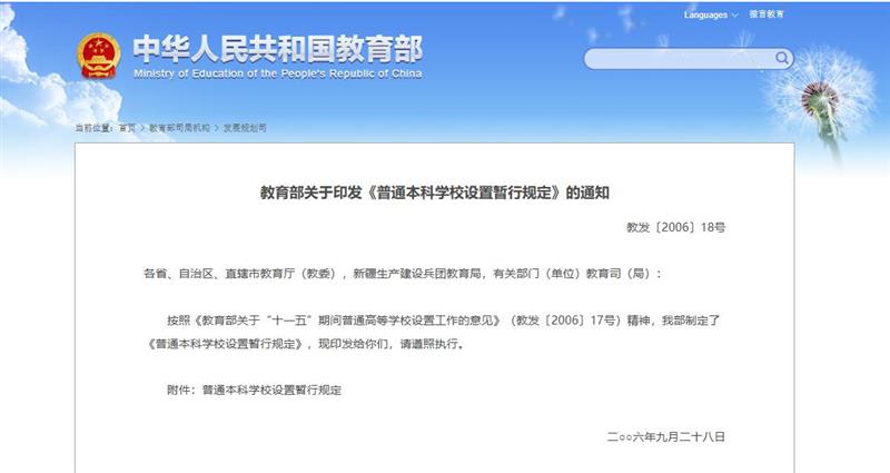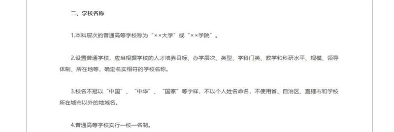 而按照《教育部關(guān)于“十一五”期間普通高等學校設置工作的意見》(教發(fā)〔2006〕17號)精神,教育部2006年制定印發(fā)了《普通本科學校設置暫行規(guī)定》, 其中第二大點關(guān)于“學校名稱”的第3條規(guī)定:校名不冠以“中國”“中華”“國家”等字樣,不以個人姓名命名,不使用省、自治區(qū)、直轄市和學校所在城市以外的地域名。