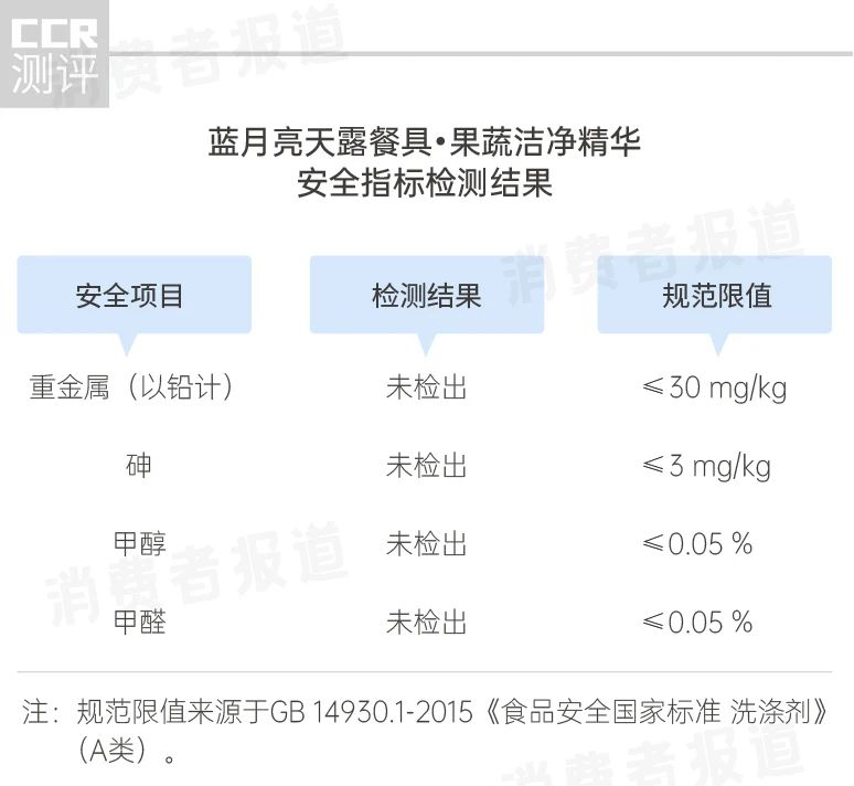 2020年8月,《消費(fèi)者報(bào)道》選取了一款主打“無(wú)油餐洗”的藍(lán)月亮天露餐具·果蔬潔凈精華,送至第三方權(quán)威檢測(cè)機(jī)構(gòu)進(jìn)行了全方位的檢測(cè),包括去污能力,以及重金屬、砷、甲醇、甲醛、皮膚刺激試驗(yàn)等安全指標(biāo)。