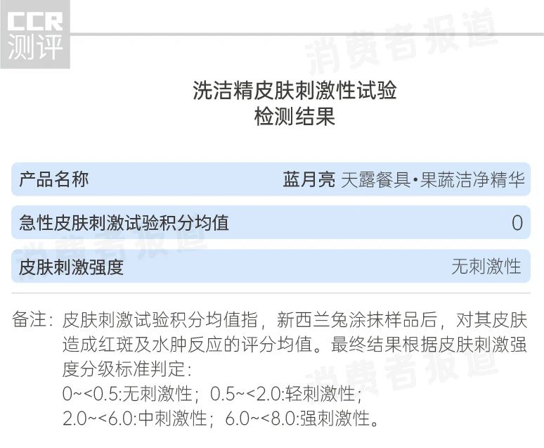 不僅如此,還進(jìn)行了更為直接客觀的皮膚刺激性試驗(yàn),結(jié)果顯示,藍(lán)月亮天露餐具·果蔬潔凈精華的急性皮膚刺激實(shí)驗(yàn)積分均值為0,根據(jù)皮膚刺激強(qiáng)度標(biāo)準(zhǔn),結(jié)論為無(wú)刺激性,即不會(huì)對(duì)皮膚造成刺激。