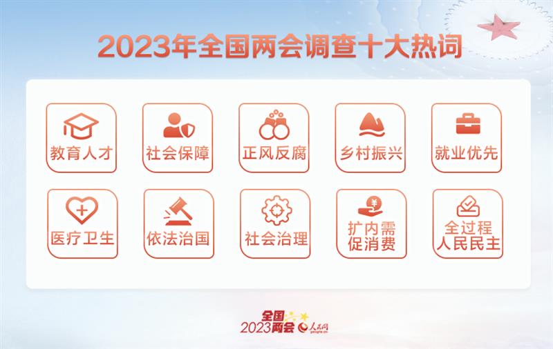 經(jīng)過網(wǎng)友投票,“教育人才”“社會保障”“正風反腐”“鄉(xiāng)村振興”“就業(yè)優(yōu)先”“醫(yī)療衛(wèi)生”“依法治國”“社會治理”“擴內(nèi)需促消費”“全過程人民民主”入選十大熱詞。