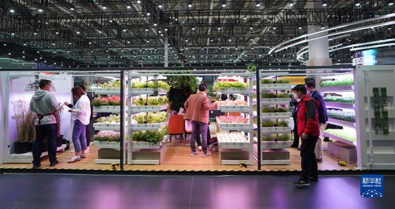 觀眾在第五屆進(jìn)博會食品及農(nóng)產(chǎn)品展區(qū)參觀集裝箱植物工廠的模型(2022年11月7日攝)。新華社記者 劉穎 攝