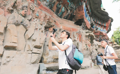 2020年7月2日,來自英國的海外視頻博主在重慶大足石刻景區(qū)拍攝游玩體驗視頻,向世界推介重慶。黃 舒攝 (人民圖片)