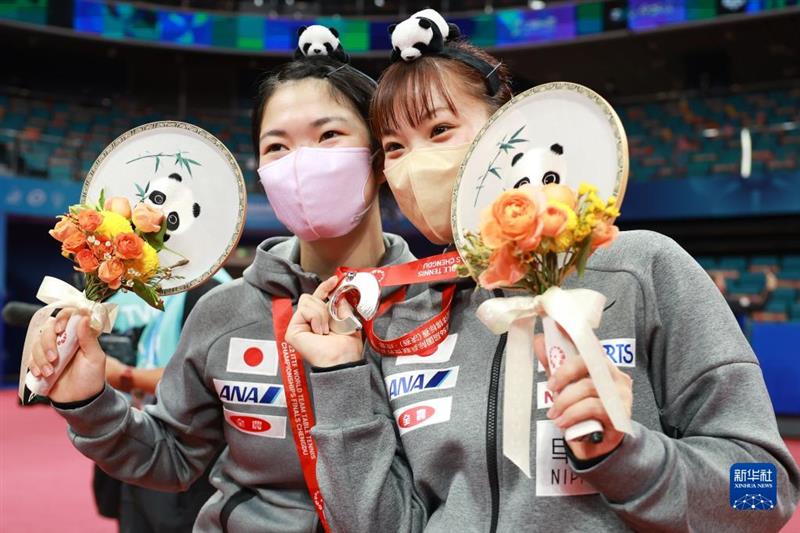 10月8日,日本隊選手長崎美柚(右)、木原美悠頭戴熊貓頭飾在頒獎儀式后合影留念。新華社記者 劉續(xù) 攝