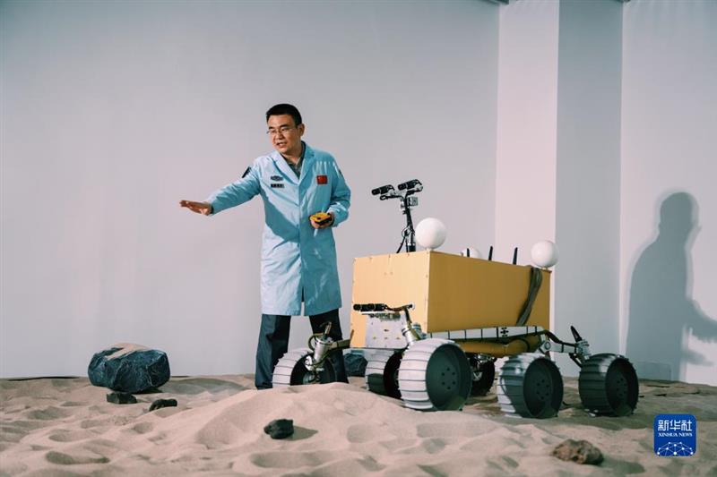 劉傳凱在北京航天飛行控制中心火星車(chē)模擬試驗(yàn)場(chǎng)地講解任務(wù)情況(2022年6月30日攝)。新華社發(fā)(謝集瀟 攝)