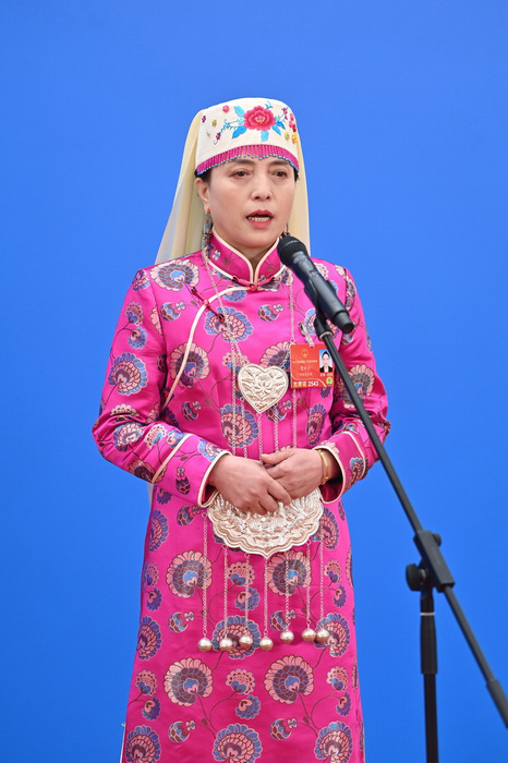全國人大代表夏吾卓瑪通過網(wǎng)絡(luò)視頻方式接受采訪。