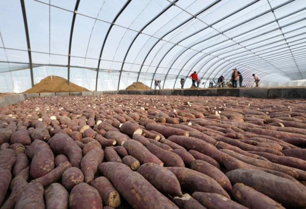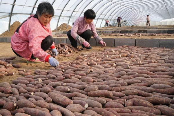 ↑3月25日,河北省盧龍縣木井鎮(zhèn)一家紅薯種植專業(yè)合作社社員在紅薯育苗棚內(nèi)工作。