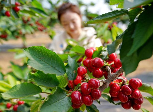 ↑3月25日,游客在河北秦皇島海港區(qū)華昆生態(tài)園內(nèi)采摘櫻桃。