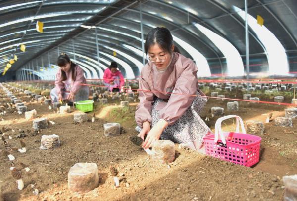 ↑3月25日,河北省邢臺(tái)市南和區(qū)河郭鎮(zhèn)刁莊村農(nóng)民在溫室大棚內(nèi)采摘羊肚菌。