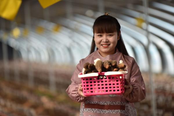 ↑3月25日,河北省邢臺(tái)市南和區(qū)河郭鎮(zhèn)刁莊村農(nóng)民在溫室大棚內(nèi)展示采摘的羊肚菌。