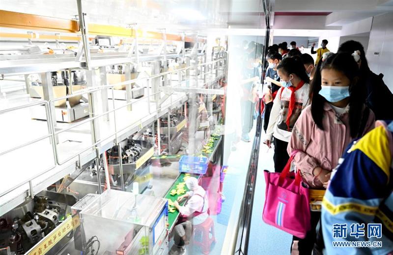 4月29日,在廣西柳州螺螄粉產(chǎn)業(yè)園,參加研學(xué)團(tuán)的師生在一家螺螄粉企業(yè)參觀。
