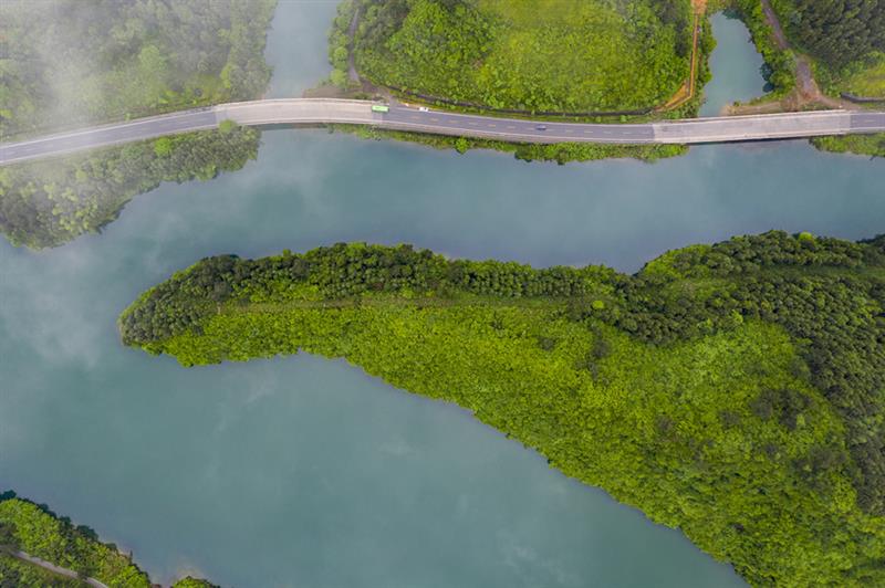 人民網(wǎng)長沙5月20日電 5月19日,在湖南省湘西土家族苗族自治州吉首市躍進(jìn)水庫,青山碧水,云霧繚繞,風(fēng)景如畫。(劉振軍)