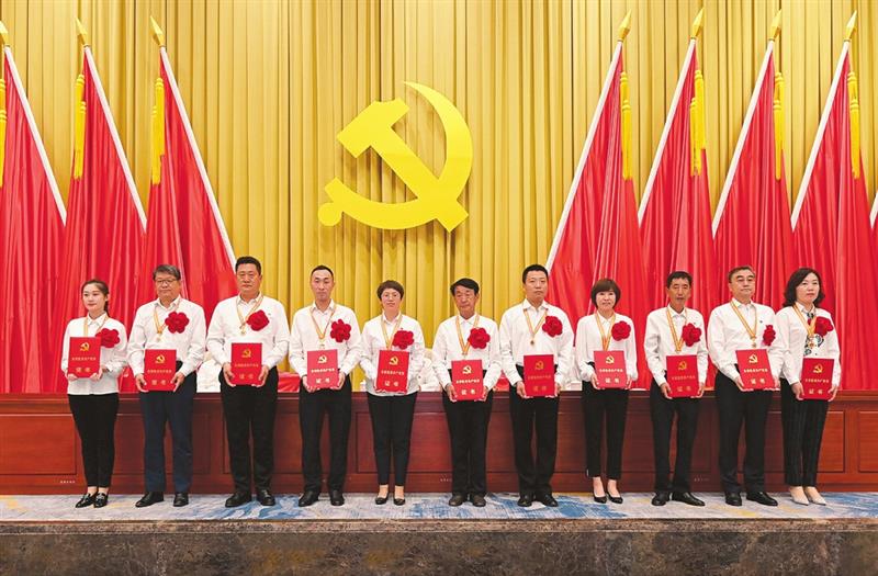 6月22日,全省“兩優(yōu)一先”表彰大會(huì)上,受到表彰的“全省優(yōu)秀共產(chǎn)黨員”代表上臺(tái)領(lǐng)獎(jiǎng)。山西日?qǐng)?bào)記者李聯(lián)軍攝