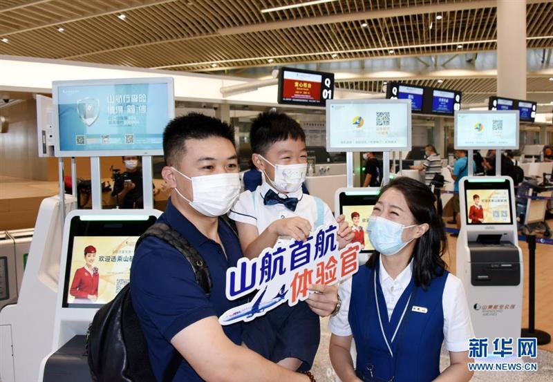 8月12日,首航旅客與航空公司工作人員互動(dòng)。新華社記者 李紫恒 攝