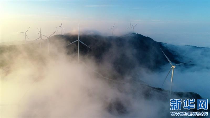 一臺臺風力發(fā)電機矗立在群山之巔,云霧繚繞,美不勝收。新華網(wǎng)發(fā) 鄧龍華 攝