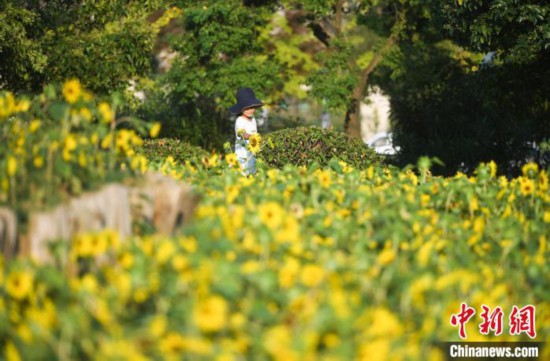 圖為:在安徽省合肥市蜀山區(qū)四季花海公園,小朋友在向日葵花叢中游玩?!№n蘇原 攝