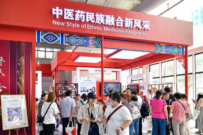 中醫(yī)藥民族融合新風(fēng)采展區(qū)擠滿了來參觀體驗的觀眾。(畢尚宏攝)