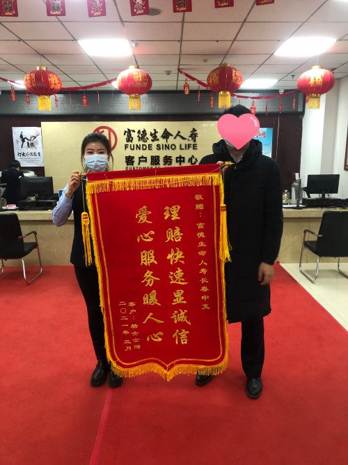因楊女士還要開(kāi)始下一次化療治療,無(wú)法親自到場(chǎng)。特委托愛(ài)人于3月12日前往公司柜面,贈(zèng)送“理賠快速顯誠(chéng)信 愛(ài)心服務(wù)暖人心”的錦旗表達(dá)謝意。楊女士愛(ài)人表示,楊女士當(dāng)時(shí)購(gòu)買(mǎi)保險(xiǎn)時(shí),每份保單的保額并不高。慶幸自己和楊女士都在保險(xiǎn)公司工作,具備風(fēng)險(xiǎn)意識(shí),為家人購(gòu)買(mǎi)了很多保險(xiǎn)。楊女士有了公司和家人的陪伴,感到十分安心,增添了戰(zhàn)勝病魔的勇氣和底氣。”