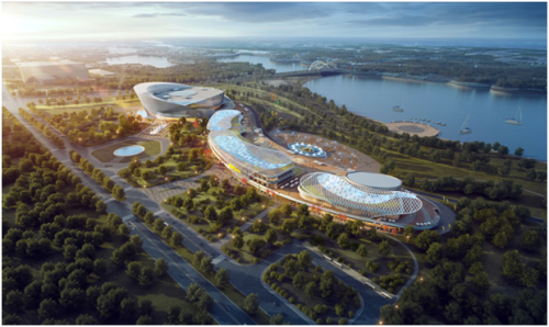 濟南華僑城首期開發(fā)文旅項目——華僑城歡樂薈,項目位于經(jīng)十東路以北、繡源河?xùn)|岸,坐落濱水核心區(qū),項目占地面積約99畝,總建筑面積約6萬平米,總投資6億。該項目是章丘城市形象的展示窗口和華僑城文化精神承載與展示的空間,還將作為文化藝術(shù)展、商業(yè)展覽、藝術(shù)活動、品牌發(fā)布的舉辦場所,成為繡源河畔獨具特色的城市活力空間。建筑空間形態(tài)設(shè)計理念取自章丘的市花——荷花,象征高潔的氣質(zhì),也恰恰是章丘精神的寫照。在文化中心北側(cè)的配套商業(yè)建筑,設(shè)計為三條游向蓮花的錦鯉,既表達“連年有余”的柷福,又在整體上形成了中國傳統(tǒng)“如意”的造型。靈動的流線形態(tài)展現(xiàn)出清秀柔美的濱水氣質(zhì)。
