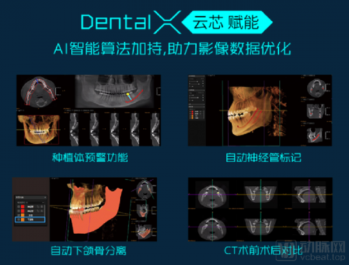 “云芯”層面,在Dental X引擎AI算法加持下,如菲森云CT除了可以獲得了影像數(shù)據(jù)優(yōu)化,還基于算法賦能增加了種植體預(yù)警、自動神經(jīng)血管標(biāo)記、自動下頜骨分離、CT術(shù)前術(shù)后對比等諸多功能。