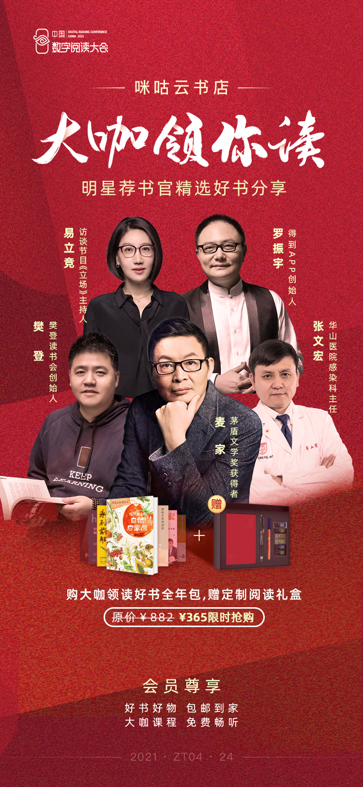 世界讀書日期間,咪咕中信書店力邀麥家、樊登、羅振宇、易立競、張文宏等12位名家大咖,作為專業(yè)薦書官在線領(lǐng)讀,精選12本好書為讀者打造“全年閱讀計劃”。廣大讀者除了可以在咪咕中信書店APP上在線購買之外,成為會員還能享受全站電子書免費讀、大咖課程免費暢聽等知識福利。