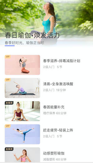 春天非常適宜做瑜伽這種包含打開、伸展等動(dòng)作的健身運(yùn)動(dòng)。瑜伽行業(yè)頭部品牌“每日瑜伽”依據(jù)春季特征及人們的練習(xí)訴求,在APP特別推出“春日新生·瑜伽瘦身寶典”、“春日瑜伽·煥發(fā)活力”等內(nèi)容專區(qū),專區(qū)內(nèi)容專為春季瑜伽練習(xí)量身設(shè)計(jì),大家可以根據(jù)自身需求自由選擇相應(yīng)課程進(jìn)行練習(xí)。