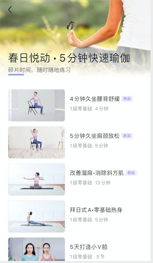 此外,每日瑜伽“春日悅動(dòng)·5分鐘快速瑜伽”專區(qū)也已在每日瑜伽APP選課界面上線,專區(qū)包含肩頸放松、美化腿部線條、馬甲線打造等20余種課程內(nèi)容,工作學(xué)習(xí)比較忙碌的朋友可利用碎片化時(shí)間進(jìn)行練習(xí)。