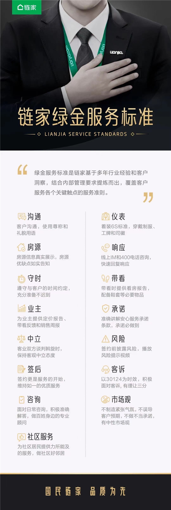 可在人與人強(qiáng)交互的中介服務(wù)中,制度層面的保障只是一方面,更重要的是,作為服務(wù)者的中介從業(yè)人員能夠建立足夠的“職業(yè)覺悟”,來自覺保持始終如一的服務(wù)。為此,鏈家在去年11月發(fā)布了規(guī)范房產(chǎn)經(jīng)紀(jì)服務(wù)的15條“綠金服務(wù)標(biāo)準(zhǔn)”。作為經(jīng)紀(jì)人的作業(yè)指導(dǎo),“綠金服務(wù)標(biāo)準(zhǔn)”覆蓋了簽約前后的所有房產(chǎn)交易流程,其中也將“簽后服務(wù)”寫進(jìn)標(biāo)準(zhǔn)之中,明確要求經(jīng)紀(jì)人“簽約也是服務(wù)的開始,維持如一的優(yōu)質(zhì)服務(wù)”。同時(shí),鏈家還會(huì)通過持續(xù)的內(nèi)部宣導(dǎo)來加強(qiáng)經(jīng)紀(jì)人的認(rèn)知。