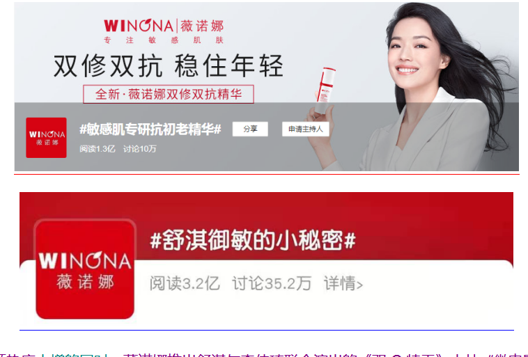 薇諾娜官方新媒體端強勢曝光3.5億,與100+位KOL合作共創(chuàng)內(nèi)容及300+位KOC共同發(fā)聲打Call;抖音話題#敏感肌抗老精華,總計播放量1120W+;微博沉淀#敏感肌專研抗初老精華#,閱讀量1.3億,討論量10萬;小紅書全天霸屏抗老精華相關搜索頁面;自媒體端招募200位新品體驗官,產(chǎn)出UGC內(nèi)容近百篇。