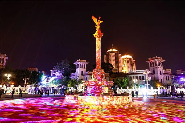 燈光設(shè)計(jì)也是此次意風(fēng)區(qū)一期開街的一大亮點(diǎn),筑景工作室從沿河景觀燈光、意風(fēng)區(qū)內(nèi)歷史建筑以及第五立面幾個(gè)角度統(tǒng)籌出發(fā),細(xì)分到每個(gè)街區(qū)進(jìn)行燈光升級(jí):主街閃耀千余個(gè)星光地?zé)?多維立體的樓體亮化交相掩映,民族路海洋元素和自由道星空元素的懸浮黑科技球燈點(diǎn)亮夜空,最終匯聚于馬可波羅廣場(chǎng)。