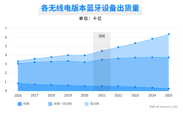 據(jù)《2021年藍(lán)牙市場(chǎng)最新資訊》數(shù)據(jù)表明,低功耗藍(lán)牙單模式設(shè)備的出貨量預(yù)計(jì)將在未來(lái)五年內(nèi)增長(zhǎng)三倍以上。低功耗藍(lán)牙將繼續(xù)對(duì)市場(chǎng)產(chǎn)生決定性影響。預(yù)計(jì)到2025年,96%的藍(lán)牙設(shè)備將包含低功耗藍(lán)牙。