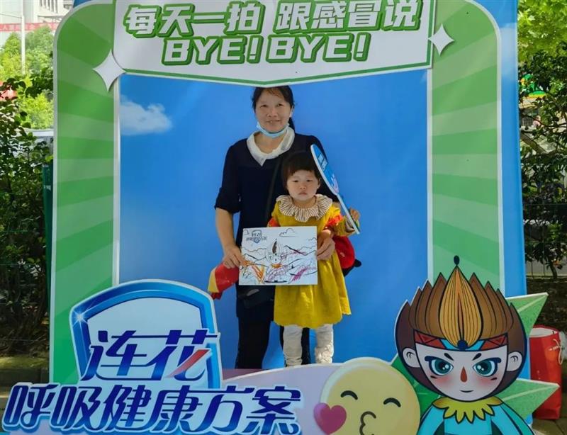 此外還有“每天一拍,跟感冒說BYE!BYE!”打卡拍照區(qū),小朋友拿著畫作,和家長一起拍照留念,畫面溫馨融洽。