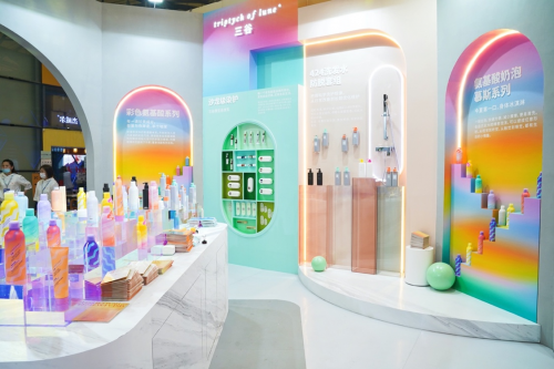 此次POLYVOLY美博會上,三谷重磅展出了三款明星產(chǎn)品——彩色氨基酸洗護套組、氨基酸奶泡慕斯系列、424洗發(fā)水防脫套組,其中424洗發(fā)水防脫套組更是在近期入圍了“天貓2021年度金妝獎人氣新品牌”。