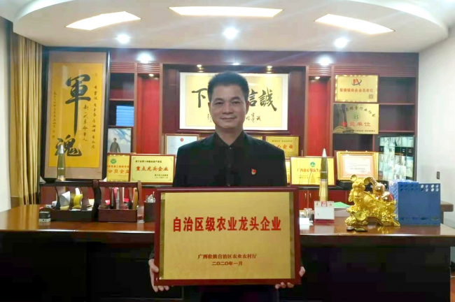 (廣西南寧市鑫開(kāi)米業(yè)有限公司榮獲“自治區(qū)級(jí)農(nóng)業(yè)龍頭企業(yè)”稱號(hào)。圖為公司負(fù)責(zé)人李旭安手捧來(lái)之不易的榮譽(yù)牌匾在公司辦公室留影。紅星攝)