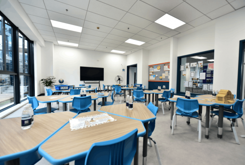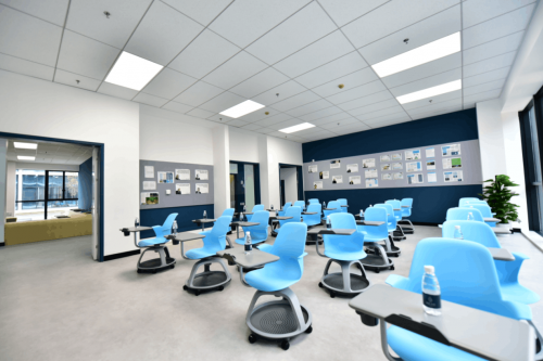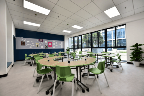 從開闊的連廊一路慢行,小學(xué)、初中及高中的樣板教室分別呈現(xiàn)在眼前。每間教室均配備傳統(tǒng)白板和電子互動(dòng)屏交互使用,將最新科學(xué)技術(shù)融入日常課堂教學(xué);教室的照明和日照亦經(jīng)過專業(yè)燈光顧問的精確計(jì)算,保證孩子的用眼健康和上課專注度。