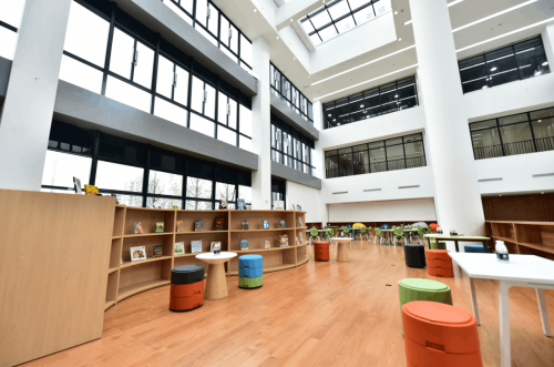 從學(xué)校正門步行至接待大廳,獨(dú)特的“樓中樓”設(shè)計(jì)映入眼簾,作為連接各個(gè)教學(xué)區(qū)域的樞紐中心,14米挑高的空間,其中坐落的正是中學(xué)部的圖書館。