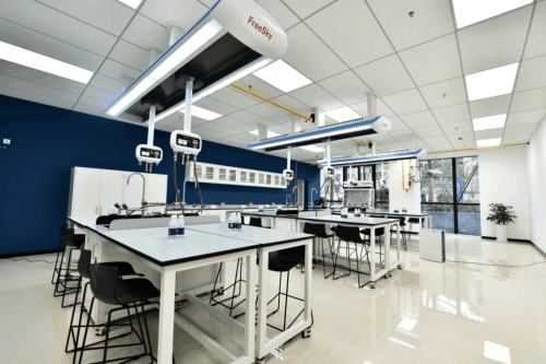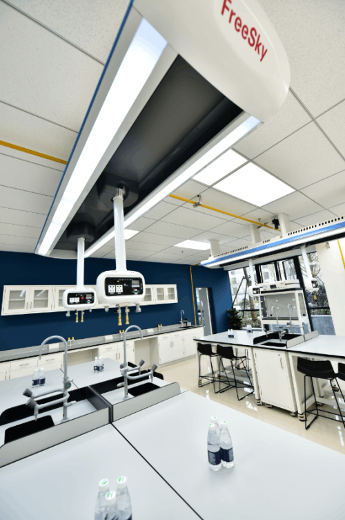 走近實(shí)驗(yàn)室,我們?nèi)滩蛔“l(fā)出了一聲聲驚嘆——專業(yè)的實(shí)驗(yàn)臺(tái)、搖臂系統(tǒng)及排風(fēng)系統(tǒng),其中,實(shí)驗(yàn)臺(tái)面采用荷蘭進(jìn)口千思板,柜體表面均經(jīng)靜電及磷化處理,搖臂可靈活調(diào)整,并設(shè)緊急停按鈕,確保各項(xiàng)實(shí)驗(yàn)操作安全,這為學(xué)生科學(xué)學(xué)習(xí)的專業(yè)性、創(chuàng)造性和可實(shí)施性提供了可靠的保障。