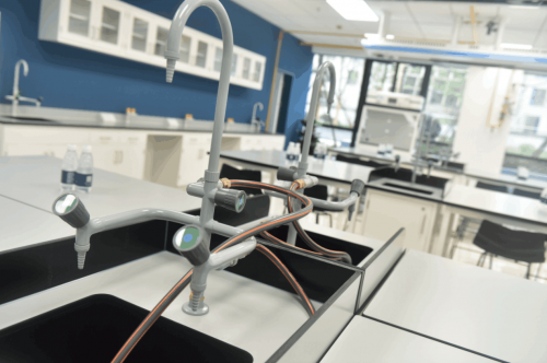在科學(xué)實(shí)驗(yàn)樓,每層都有三間不同種類的實(shí)驗(yàn)室,涵蓋物理、化學(xué)、生物學(xué)科,此外,每層樓還有一間準(zhǔn)備間和一間化學(xué)品倉(cāng)庫(kù)。